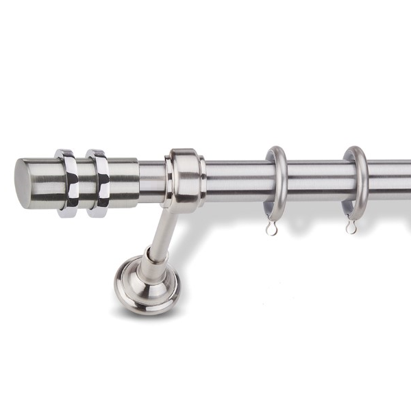 Μεταλλική ανοξείδωτη κουρτινόβεργα Enis Ματ Νίκελ, Queen της σειράς Eco σε μονή βέργα, διπλή βέργα ή διπλή με σιδηρόδρομο σε διάφορες διαστάσεις. Η διάμετρος της βέργας είναι Ø25mm και περιλαμβάνει έως 3 στηρίγματα ανάλογα με την διάσταση.