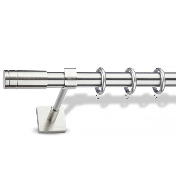 Μεταλλική ανοξείδωτη κουρτινόβεργα Enis Ματ Νίκελ/Χρώμιο, Τάπα Ρίγα με στήριγμα Como σε μονή βέργα ή διπλή με σιδηρόδρομο σε διάφορες διαστάσεις. Η διάμετρος της βέργας είναι Ø25mm και περιλαμβάνει έως 3 στηρίγματα ανάλογα με την διάσταση.
