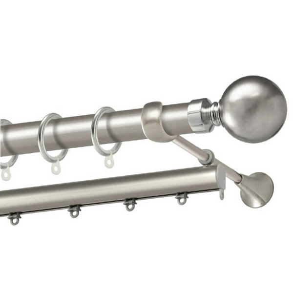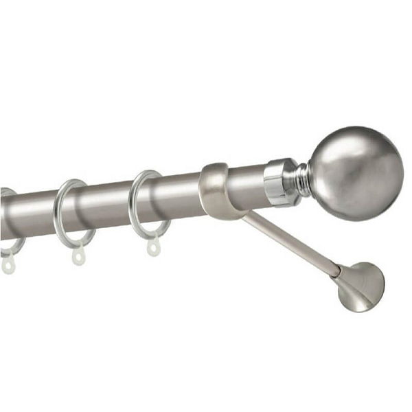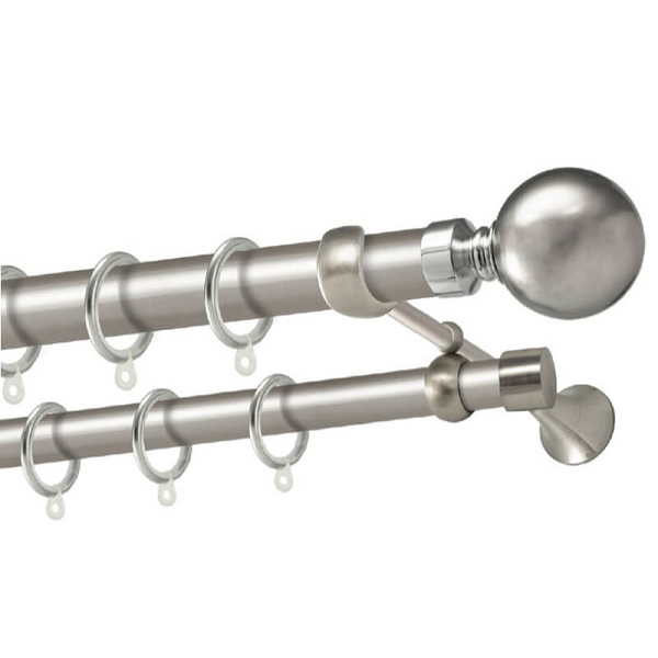 Μεταλλική κουρτινόβεργα Ρόδος οικονομικής σειράς της εταιρείας Perfect, χρώματος Ματ Νίκελ, σε μονή βέργα, διπλή βέργα ή διπλή με σιδηρόδρομο σε διάφορες διαστάσεις. Η διάμετρος της βέργας είναι Ø25mm και περιλαμβάνει έως 3 στηρίγματα ανάλογα με την διάσταση.