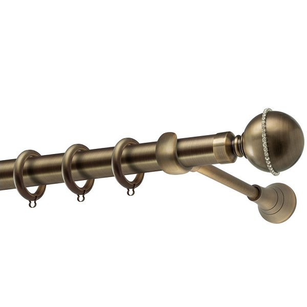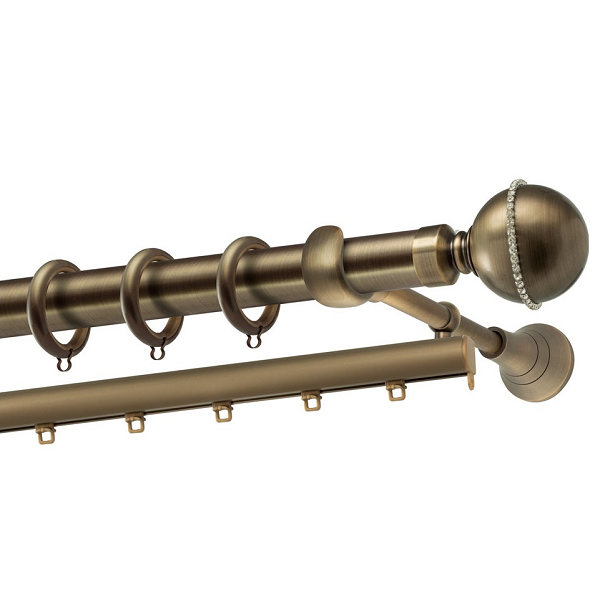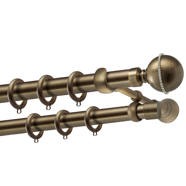 Μεταλλική κουρτινόβεργα Ρόδος Strass της εταιρείας Perfect, χρώματος Μπρονζέ, σε μονή βέργα, διπλή βέργα ή διπλή με σιδηρόδρομο σε διάφορες διαστάσεις. Η διάμετρος της βέργας είναι Ø35mm και περιλαμβάνει έως 3 στηρίγματα ανάλογα με την διάσταση.
