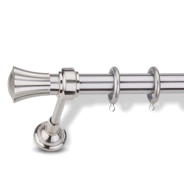 Μεταλλική ανοξείδωτη κουρτινόβεργα Enis Ματ Νίκελ, Royal της σειράς Eco σε μονή βέργα, διπλή βέργα ή διπλή με σιδηρόδρομο σε διάφορες διαστάσεις. Η διάμετρος της βέργας είναι Ø25mm και περιλαμβάνει έως 3 στηρίγματα ανάλογα με την διάσταση.