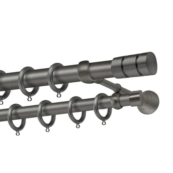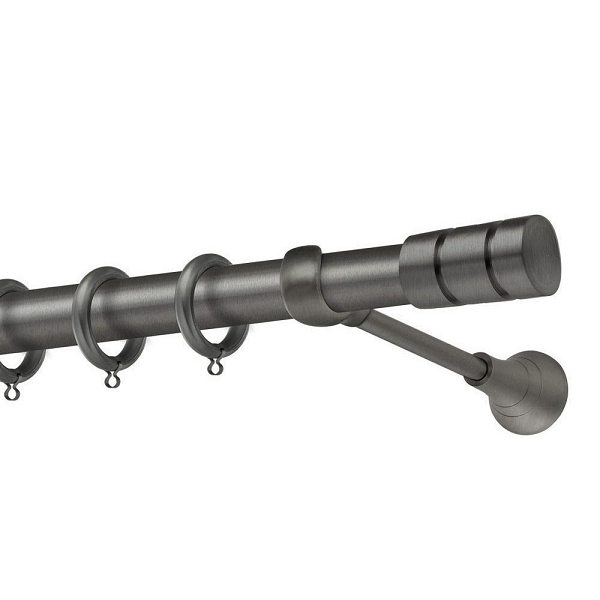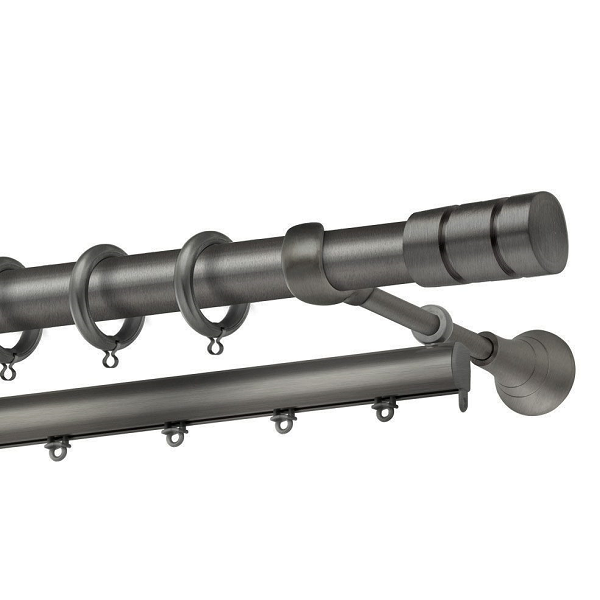 Μεταλλική κουρτινόβεργα Σαλαμίνα της εταιρείας Perfect, χρώματος Ανθρακί Ματ, σε μονή βέργα, διπλή βέργα ή διπλή με σιδηρόδρομο σε διάφορες διαστάσεις. Η διάμετρος της βέργας είναι Ø25mm και περιλαμβάνει έως 3 στηρίγματα ανάλογα με την διάσταση.
