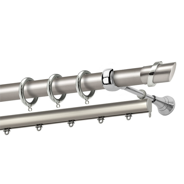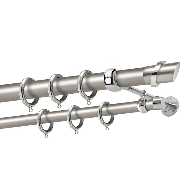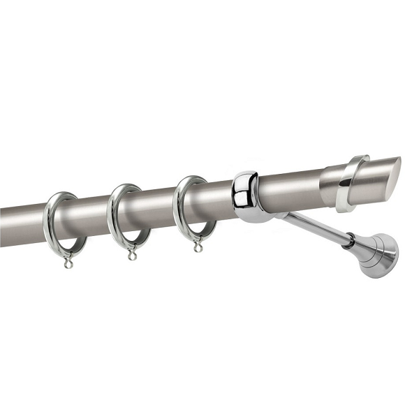 Μεταλλική κουρτινόβεργα Σαμιοπούλα της εταιρείας Perfect, χρώματος Ματ Νίκελ/Χρώμιο, σε μονή βέργα, διπλή βέργα ή διπλή με σιδηρόδρομο σε διάφορες διαστάσεις. Η διάμετρος της βέργας είναι Ø25mm και περιλαμβάνει έως 3 στηρίγματα ανάλογα με την διάσταση.