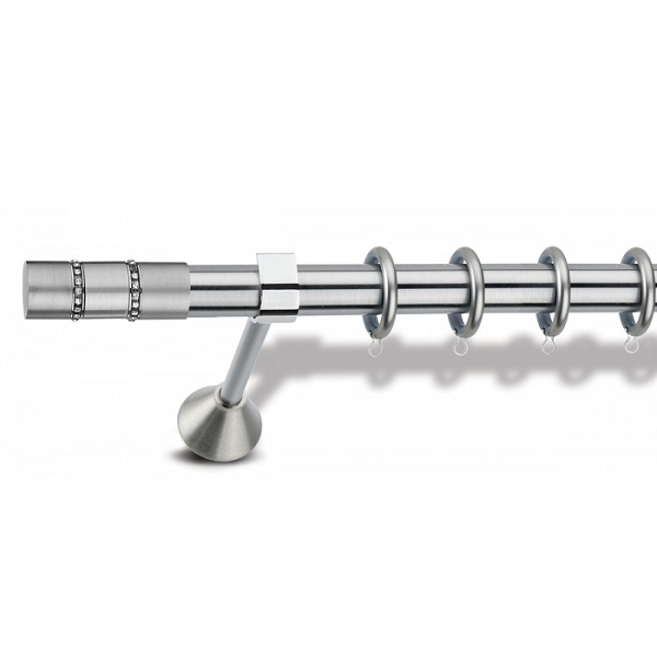 Μεταλλική ανοξείδωτη κουρτινόβεργα Enis Ματ Νίκελ, Σέριφος Strass σε μονή βέργα, διπλή βέργα ή διπλή με σιδηρόδρομο σε διάφορες διαστάσεις. Η διάμετρος της βέργας είναι Ø25mm και περιλαμβάνει έως 3 στηρίγματα ανάλογα με την διάσταση.
