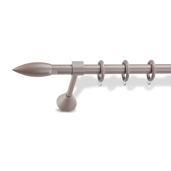 Μεταλλική κουρτινόβεργα Enis Σφαίρα σε μονή βέργα, διπλή βέργα ή διπλή με σιδηρόδρομο σε διάφορες διαστάσεις. Η διάμετρος της βέργας είναι Ø20mm και περιλαμβάνει έως 3 στηρίγματα ανάλογα με την διάσταση.