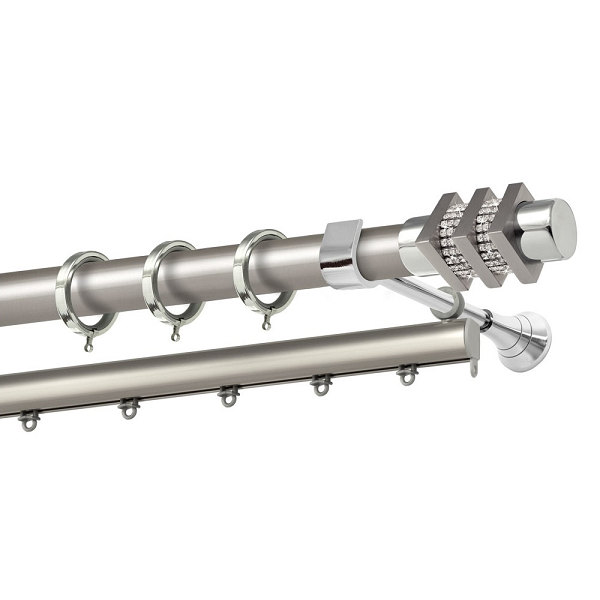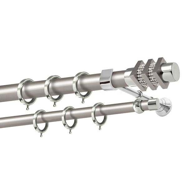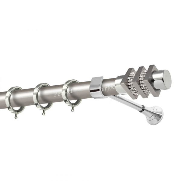 Μεταλλική κουρτινόβεργα Σκιάθος Strass της εταιρείας Perfect, χρώματος Ματ Νίκελ, σε μονή βέργα, διπλή βέργα ή διπλή με σιδηρόδρομο σε διάφορες διαστάσεις. Η διάμετρος της βέργας είναι Ø25mm και περιλαμβάνει έως 3 στηρίγματα ανάλογα με την διάσταση.