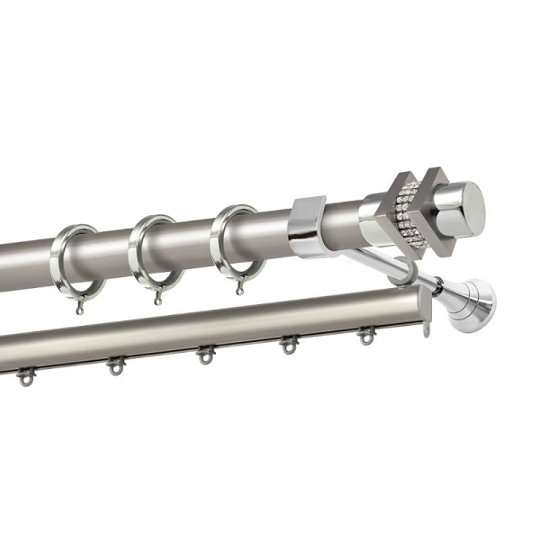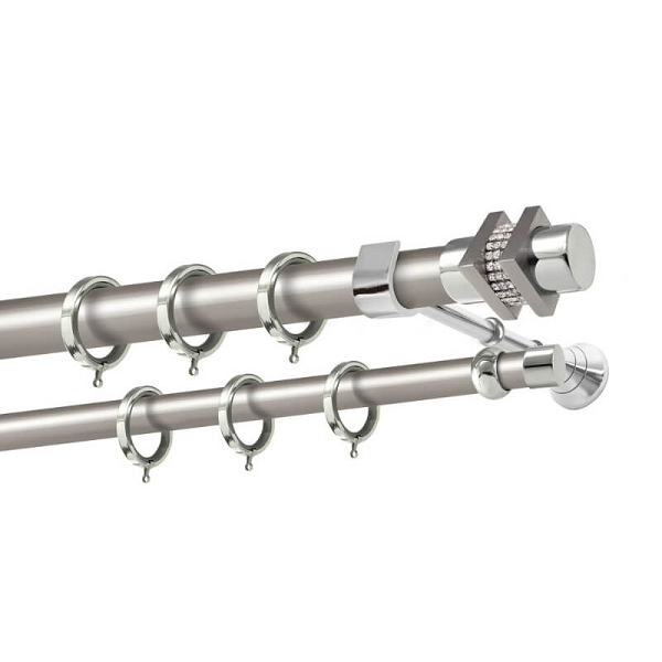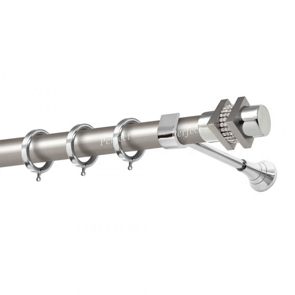 Μεταλλική κουρτινόβεργα Σκιάθος Strass της εταιρείας Perfect, χρώματος Ματ Νίκελ, σε μονή βέργα, διπλή βέργα ή διπλή με σιδηρόδρομο σε διάφορες διαστάσεις. Η διάμετρος της βέργας είναι Ø25mm και περιλαμβάνει έως 3 στηρίγματα ανάλογα με την διάσταση.