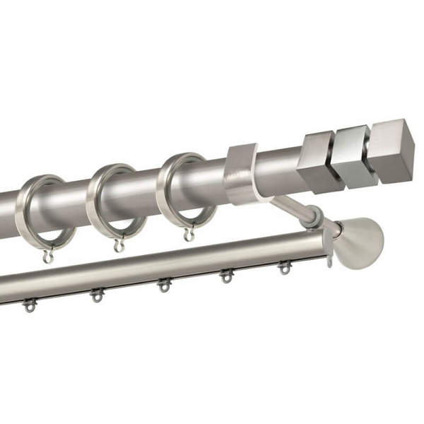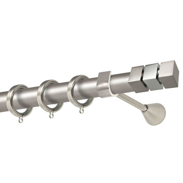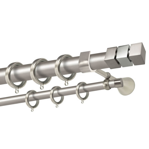 Μεταλλική κουρτινόβεργα Σκόπελος της εταιρείας Perfect, χρώματος Ματ Νίκελ, σε μονή βέργα, διπλή βέργα ή διπλή με σιδηρόδρομο σε διάφορες διαστάσεις. Η διάμετρος της βέργας είναι Ø25mm και περιλαμβάνει έως 3 στηρίγματα ανάλογα με την διάσταση.