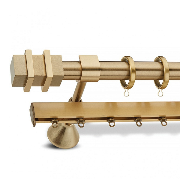 Μεταλλική ανοξείδωτη κουρτινόβεργα Enis Ματ Όρο, Σπάρτη σε μονή βέργα, διπλή βέργα ή διπλή με σιδηρόδρομο σε διάφορες διαστάσεις. Η διάμετρος της βέργας είναι Ø25mm και περιλαμβάνει έως 3 στηρίγματα ανάλογα με την διάσταση.
