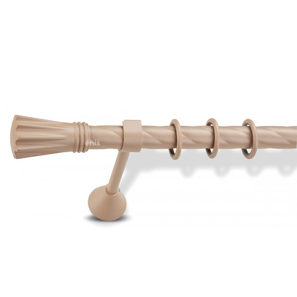 Μεταλλική κουρτινόβεργα στριφτή Enis Κίσσαβος σε μονή βέργα, διπλή βέργα ή διπλή με σιδηρόδρομο σε διάφορες διαστάσεις. Η διάμετρος της βέργας είναι Ø25mm και περιλαμβάνει έως 3 στηρίγματα ανάλογα με την διάσταση.