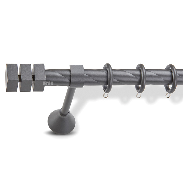 Μεταλλική κουρτινόβεργα στριφτή Enis Κλεοπάτρα σε μονή βέργα, διπλή βέργα ή διπλή με σιδηρόδρομο σε διάφορες διαστάσεις. Η διάμετρος της βέργας είναι Ø25mm και περιλαμβάνει έως 3 στηρίγματα ανάλογα με την διάσταση.