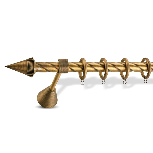 Μεταλλική κουρτινόβεργα στριφτή Enis Μύκονος σε μονή βέργα διαφόρων διαστάσεων. Η διάμετρος της βέργας είναι Ø20mm και περιλαμβάνει έως 3 στηρίγματα ανάλογα με την διάσταση.