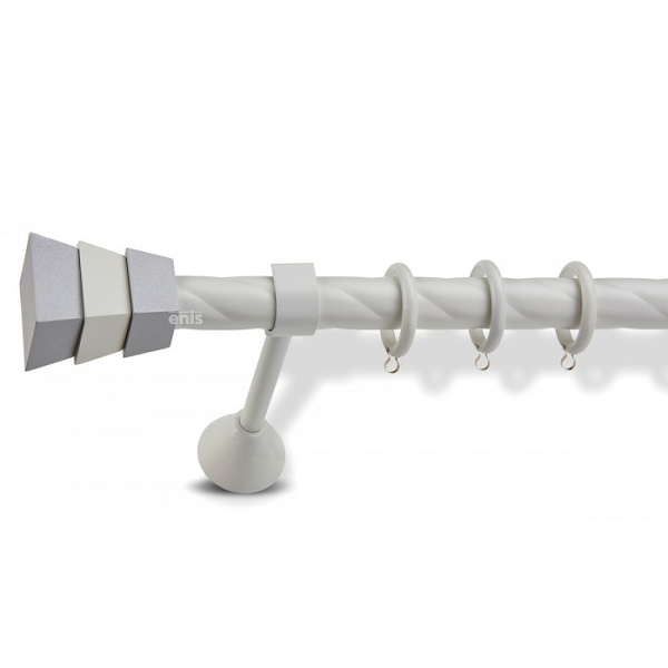 Μεταλλική κουρτινόβεργα στριφτή Enis Τιέν σε μονή βέργα, διπλή βέργα ή διπλή με σιδηρόδρομο σε διάφορες διαστάσεις. Η διάμετρος της βέργας είναι Ø25mm και περιλαμβάνει έως 3 στηρίγματα ανάλογα με την διάσταση.