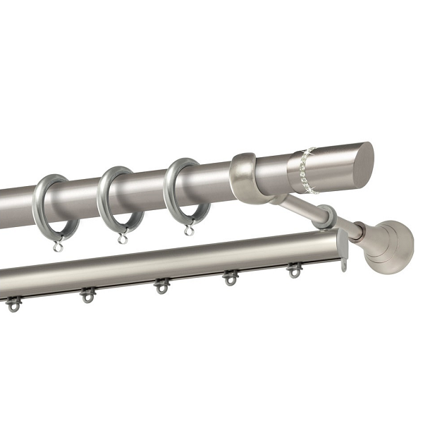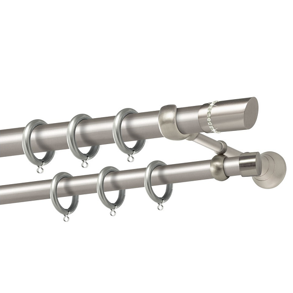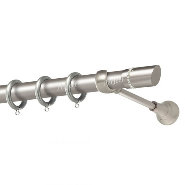 Μεταλλική κουρτινόβεργα Σύμη Strass της εταιρείας Perfect, χρώματος Ματ Νίκελ, σε μονή βέργα, διπλή βέργα ή διπλή με σιδηρόδρομο σε διάφορες διαστάσεις. Η διάμετρος της βέργας είναι Ø25mm και περιλαμβάνει έως 3 στηρίγματα ανάλογα με την διάσταση.