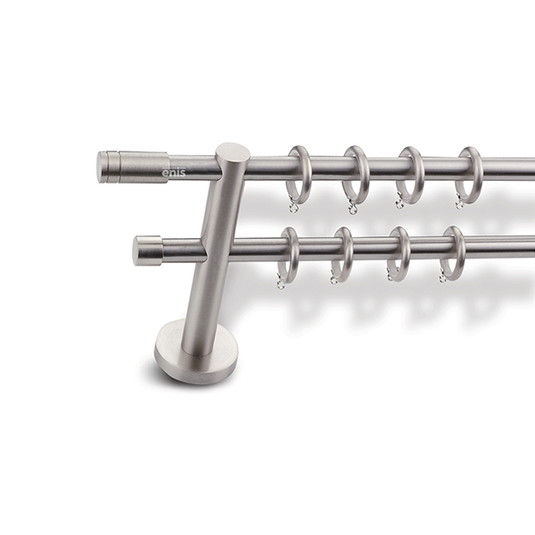 Μεταλλική ανοξείδωτη κουρτινόβεργα Enis Ματ Νίκελ, Τάπα Ρίγα σε διπλή βέργα διαφόρων διαστάσεων. Η διάμετρος της βέργας είναι Ø16mm και περιλαμβάνει έως 3 στηρίγματα ανάλογα με την διάσταση.