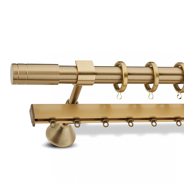 Μεταλλική ανοξείδωτη κουρτινόβεργα Enis Ματ Όρο, Τάπα Ρίγα σε μονή βέργα, διπλή βέργα ή διπλή με σιδηρόδρομο σε διάφορες διαστάσεις. Η διάμετρος της βέργας είναι Ø25mm και περιλαμβάνει έως 3 στηρίγματα ανάλογα με την διάσταση.
