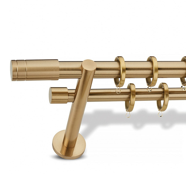 Μεταλλική ανοξείδωτη κουρτινόβεργα Enis Ματ Όρο, Τάπα Ρίγα σε διπλή βέργα διαφόρων διαστάσεων. Η διάμετρος της βέργας είναι Ø25mm και περιλαμβάνει έως 3 στηρίγματα ανάλογα με την διάσταση.