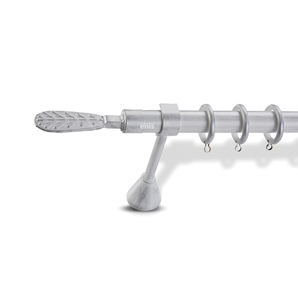 Μεταλλική κουρτινόβεργα Enis Τεό σε μονή βέργα, διπλή βέργα ή διπλή με σιδηρόδρομο σε διάφορες διαστάσεις. Η διάμετρος της βέργας είναι Ø25mm και περιλαμβάνει έως 3 στηρίγματα ανάλογα με την διάσταση.