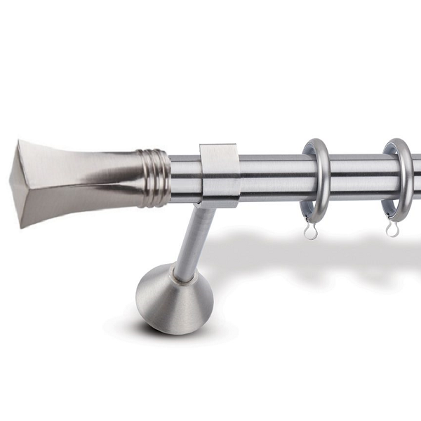 Μεταλλική ανοξείδωτη κουρτινόβεργα Enis Ματ Νίκελ, Τήλος σε μονή βέργα, διπλή βέργα ή διπλή με σιδηρόδρομο σε διάφορες διαστάσεις. Η διάμετρος της βέργας είναι Ø25mm και περιλαμβάνει έως 3 στηρίγματα ανάλογα με την διάσταση.