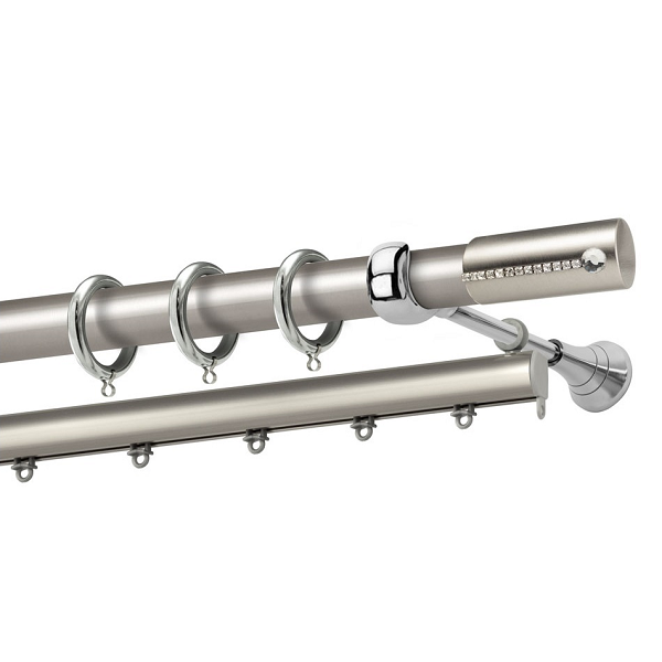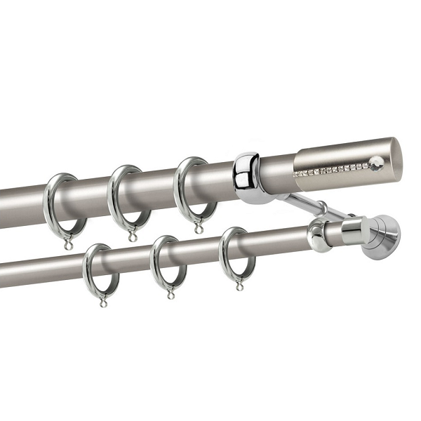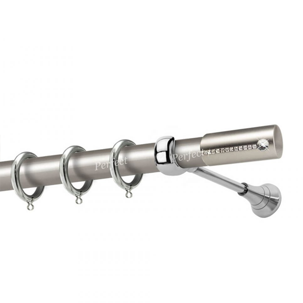 Μεταλλική κουρτινόβεργα Ζάκυνθος Strass της εταιρείας Perfect, χρώματος Ματ Νίκελ/Χρώμιο, σε μονή βέργα, διπλή βέργα ή διπλή με σιδηρόδρομο σε διάφορες διαστάσεις. Η διάμετρος της βέργας είναι Ø25mm και περιλαμβάνει έως 3 στηρίγματα ανάλογα με την διάσταση.