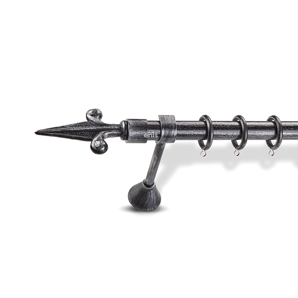 Μεταλλική κουρτινόβεργα Enis σφυρήλατη, Ακόντιο σε μονή βέργα, διπλή βέργα ή διπλή με σιδηρόδρομο σε διάφορες διαστάσεις. Η διάμετρος της βέργας είναι Ø25mm και περιλαμβάνει έως 3 στηρίγματα ανάλογα με την διάσταση.