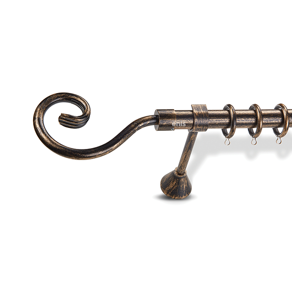 Μεταλλική κουρτινόβεργα Enis σφυρήλατη, Γκλίτσα σε μονή βέργα, διπλή βέργα ή διπλή με σιδηρόδρομο σε διάφορες διαστάσεις. Η διάμετρος της βέργας είναι Ø25mm και περιλαμβάνει έως 3 στηρίγματα ανάλογα με την διάσταση.