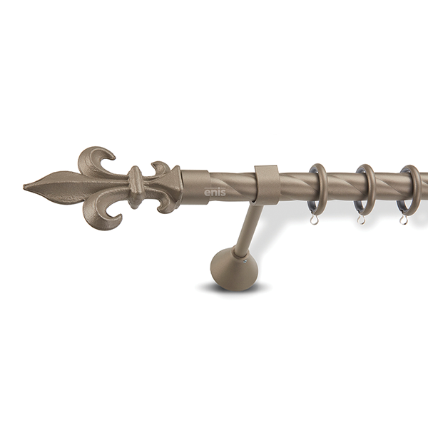 Μεταλλική κουρτινόβεργα Enis σφυρήλατη, Λόγχη Ιπποτών σε μονή βέργα, διπλή βέργα ή διπλή με σιδηρόδρομο σε διάφορες διαστάσεις. Η διάμετρος της βέργας είναι Ø25mm και περιλαμβάνει έως 3 στηρίγματα ανάλογα με την διάσταση.