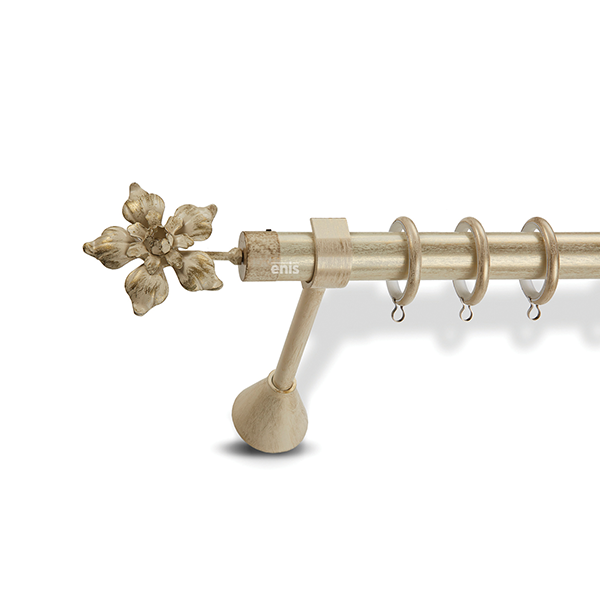 Μεταλλική κουρτινόβεργα Enis σφυρήλατη, Μαργαρίτα σε μονή βέργα, διπλή βέργα ή διπλή με σιδηρόδρομο σε διάφορες διαστάσεις. Η διάμετρος της βέργας είναι Ø25mm και περιλαμβάνει έως 3 στηρίγματα ανάλογα με την διάσταση.