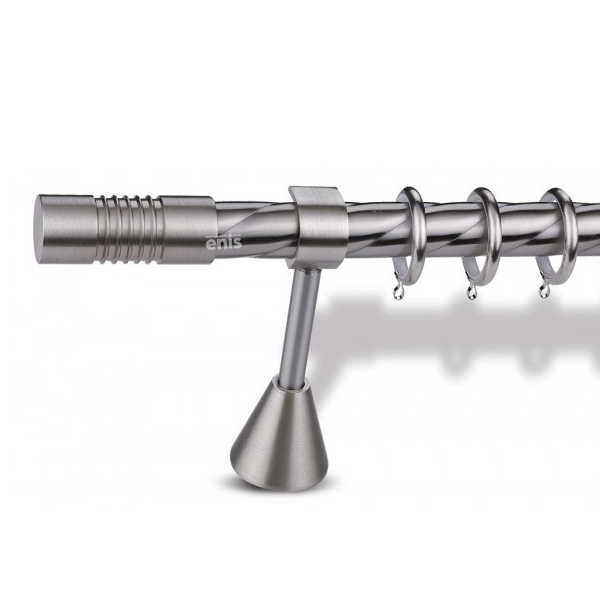 Μεταλλική ανοξείδωτη κουρτινόβεργα Enis Ματ Νίκελ, Αντικέ, Ματ Χρυσό ή Παστέλ χρώματος, Κασσάνδρα σε μονή στριφτή βέργα διαφόρων διαστάσεων. Η διάμετρος της βέργας είναι Ø25mm και περιλαμβάνει έως 3 στηρίγματα ανάλογα με την διάσταση.