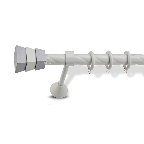 Μεταλλική κουρτινόβεργα στριφτή Enis Τιέν σε μονή βέργα, διπλή βέργα ή διπλή με σιδηρόδρομο σε διάφορες διαστάσεις. Η διάμετρος της βέργας είναι Ø25mm και περιλαμβάνει έως 3 στηρίγματα ανάλογα με την διάσταση.