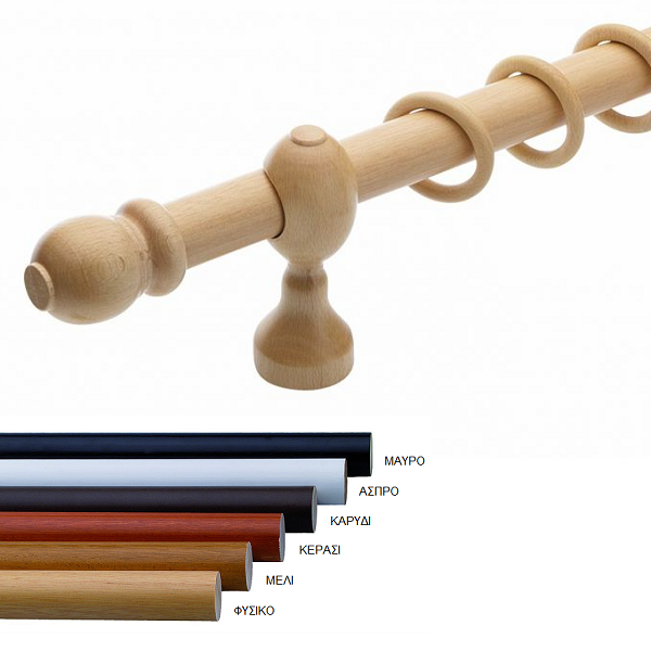 Ξύλινο κουρτινόξυλο Κλασικό σε διάφορα χρώματα, μονής βέργας με διάμετρο κονταριού Ø35mm.
