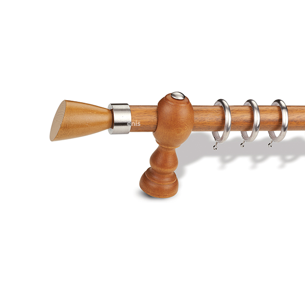 Ξύλινο κουρτινόξυλο Πίζα σε διάφορα χρώματα με μεταλλικά εξαρτήματα πολλών αποχρώσεων, μονής βέργας με διάμετρο κονταριού Ø35mm.